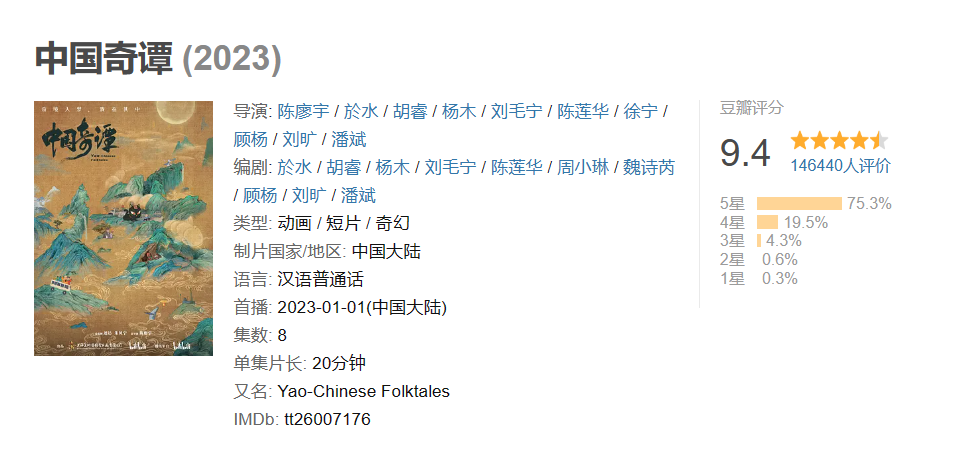 财联社1月21日讯(编辑 笠晨)2023年伊始,国产动画市场意料之外出现了一部口碑爆款作品《中国奇谭》。目前,总播放量破亿,B站评分高达9.9分,豆瓣评分9.4分,评分人数近15万,口碑和播放量双爆。