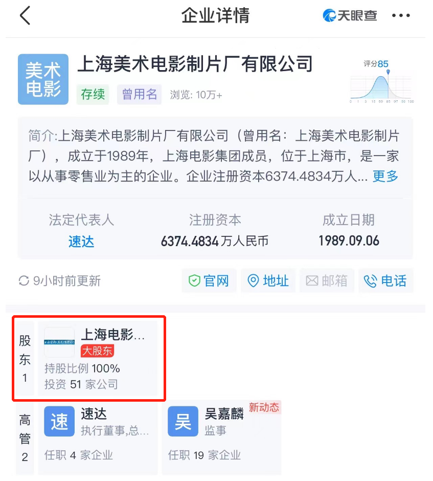 值得注意的是,天眼查数据显示,上海美术电影制片厂是由上海电影(集团)有限公司100%持股。