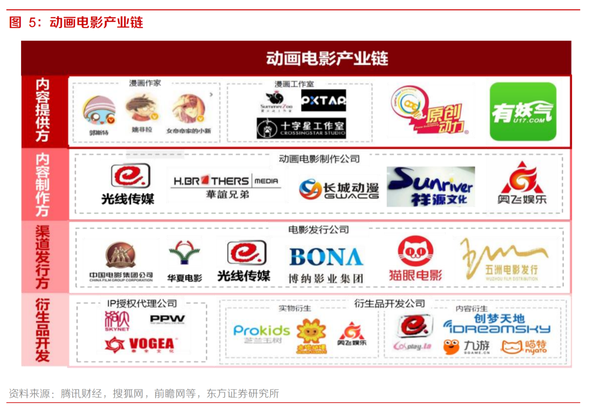 东方证券施红梅等人认为,预计2025年中国动画电影市场空间达到153亿元。动画电影产业链主要可分为四级。上游是内容方,主要包括可供改编动画的网文IP和漫画IP提供方、出品方以及原创动画公司。中上游是内容制作方,主要包括参与动画电影各环节制作的公司。中下游是渠道发行方,主要播放渠道包括网络视频播放平台、电视台以及电影院线等。下游是衍生品开发公司,包括IP授权代理公司,也包括衍生开发公司。