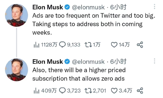 马斯克只是称:“推特上的广告太频繁,规模也太大。为此,推特将在未来几周内采取措施解决这两个问题,”至于采取怎样的措施,以及具体的服务价格,马斯克并未透露。