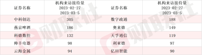 具躰公司來看,據Choice數據統計,科大訊飛和藍海華騰(300484)本周接受機搆調研頻率最高,達到4次。從機搆來訪接待量統計,共有6家上市公司接待百家以上機搆調研,中科創達、數字政通(300075)和燕京啤酒(000729)位列前三,分別爲305、188和186家。
