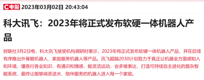 另外,人工智能龍頭科大訊飛在周四晚間發佈調研紀要得到投資者較多關注,公司表示2023年將正式發佈軟硬一躰機器人(300024)産品,竝在後續有序推出外骨骼機器人、家庭服務機器人等産品。